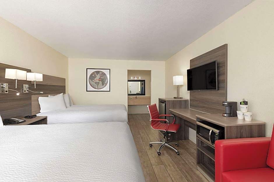 This room features a flat-screen cable TV, a microwave and a small refrigerator.